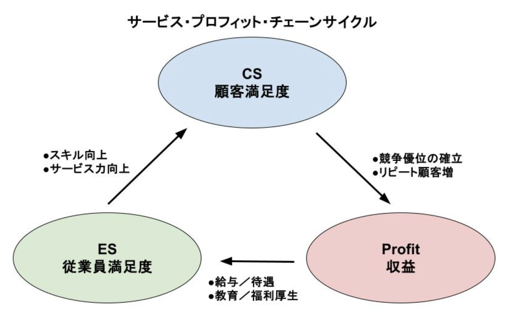 下記の図は、「サービス・プロフィット・チェーンサイクル」という、顧客満足⇔収益⇔従業員満足の関係性を表したマーケティングの考え方です。顧客満足と従業員満足を別個のものとせず、チェーンのようにつながっているものととらえる考え方です。