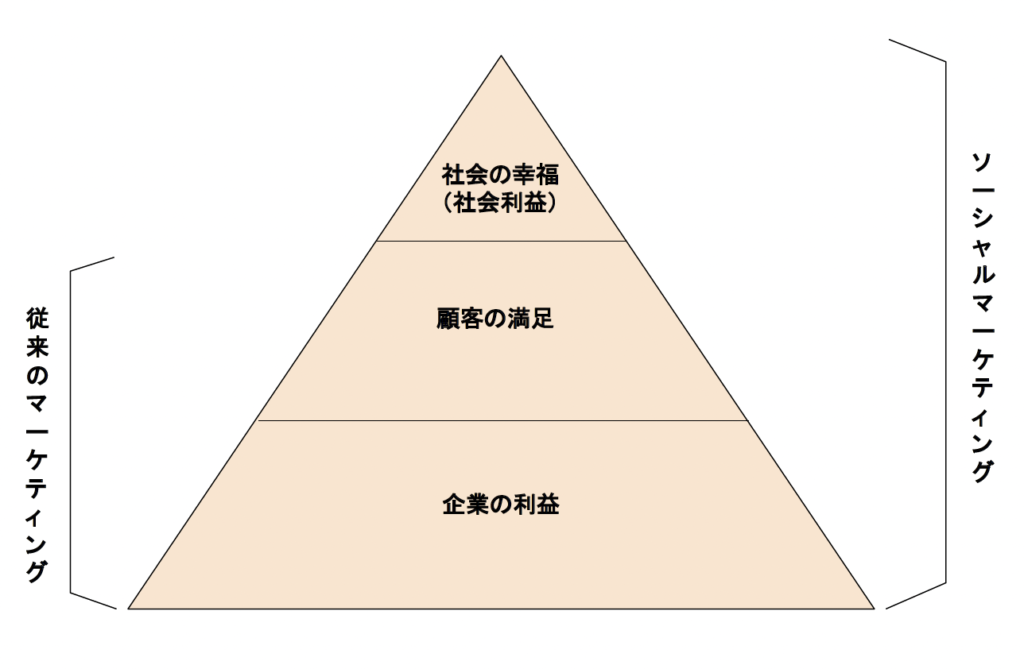 上の図は、現在の最先端のマーケティングである「ソーシャル・マーケティング」の図ですが、この観点からも、従来型の「企業の利益」と「顧客満足」を基盤としたピラミッド構造ではなく、最上部に「社会の幸福=社会利益」を追求することが重要だと考えられています。