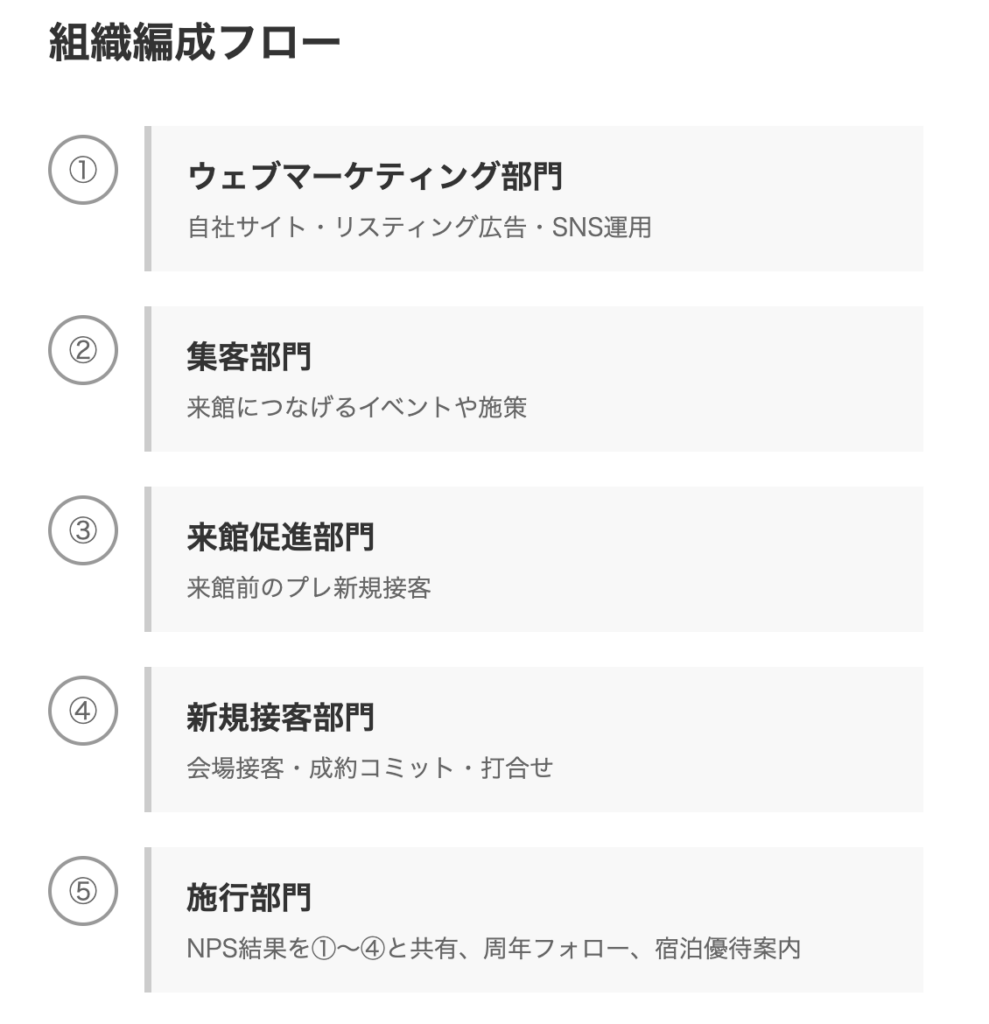 - ⑤施行部門:結婚式当日の運営、NPS結果の共有、周年フォローを担当