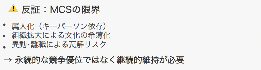 - 属人化(キーパーソン依存):自社愛や内発的動機を醸成できるキーパーソンに依存するリスクがある