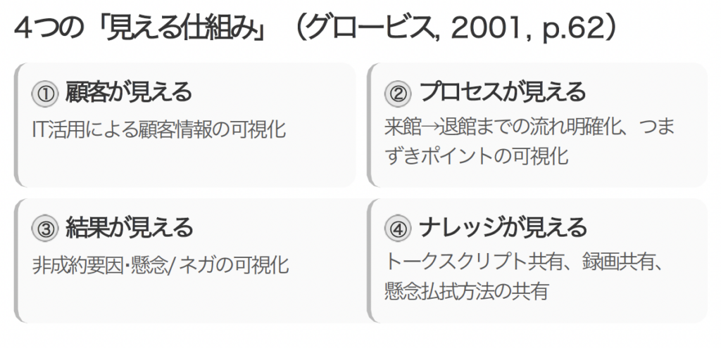 こうしたことに裏打ちされた強い現場力を構築し、さらに個々の接客における成功体験をSECIモデルで組織知として共有することが重要です。