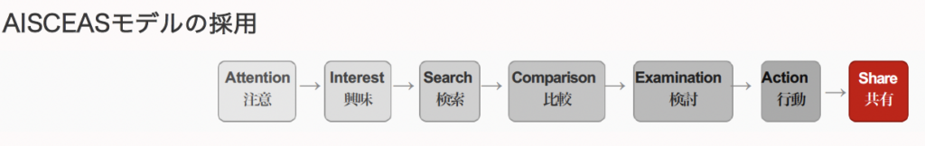 顧客の行動をAISCEASモデルで考えてみましょう。これは顧客の購買行動を7つのステップで表したモデルです。