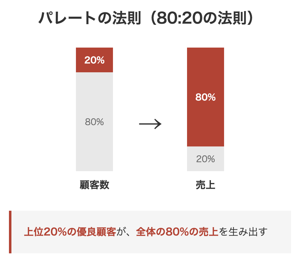 パレートの法則とは、「上位20%の優良顧客が、全体の80%の売上を生み出す」という経験則です。別名「80:20の法則」とも呼ばれます。