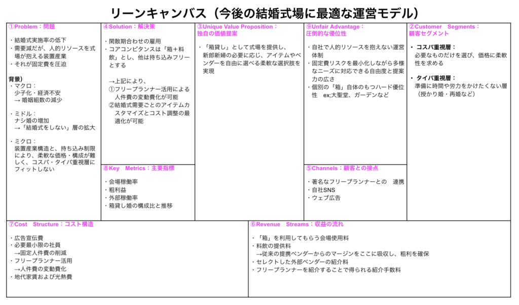 リーンキャンバスの観点から、今後の結婚式場の運営モデルを考えてみましょう。
