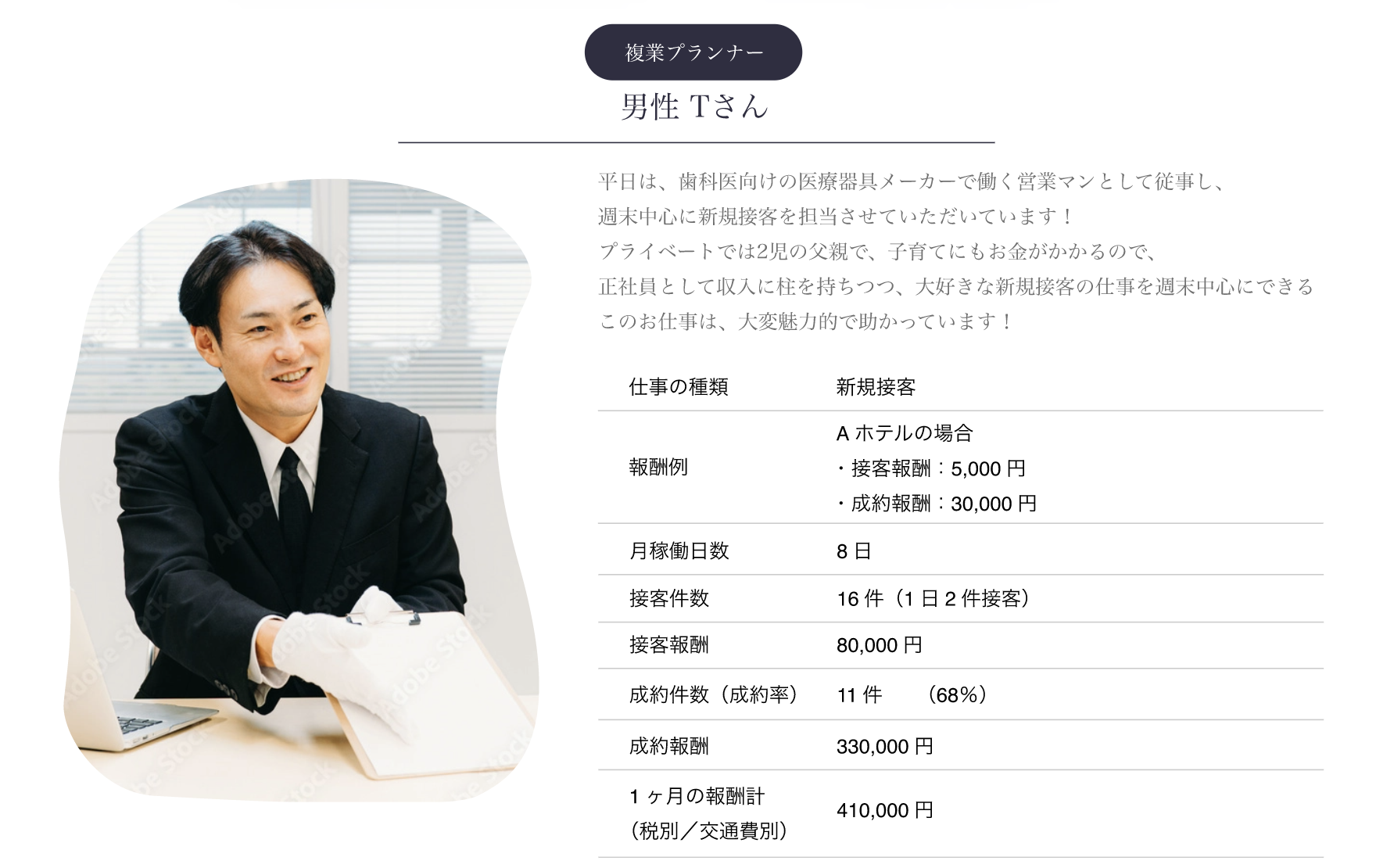 | 働き方について | ●新規接客当日の進め方 ・基本、新規接客業務の30分程度前に会場にお越しください。 ・会場責任者より、顧客詳細をご伝達させていただきます。 ・接客1件につき、3~4時間程度を見込みます。 ・会場によっては服装規定や各種アピアランス規定がございます ●実際働いている方の事例 ・女性Tさん(35) ・働き方;複業プランナー ・担当件数;1ヶ月8日/16件 ・成約率;70% ・お声; 平日は、歯科医向けの医療器具メーカーで働く 法人営業担当として従事し、 週末中心に新規接客を担当させていただいています! プライベートでは2児の母親で、子育てにもお金がかかるので、 正社員として収入に柱を持ちつつ、大好きな新規接客の仕事を週末中心にできるこのお仕事は、大変魅力的で助かっています! ・男性Oさん(35) ・働き方;専業プランナー ・担当件数;1ヶ月15日/30件 ・成約率;60% ・お声; もともと婚礼施設で新規接客のマネジャーとして勤務していましたが、 飲食店に転職し、こういう働き方もあるのだなと兼業で求人で発見し、 複業として応募しました。 結果を出せば出すだけ成果もでるので、この仕事に一本化することを熟考し、プラスワンの責任者の方も快諾いただいたので、専業へと転向しました。一つの出向先でも、会場ごとに特徴や顧客層が異なるので、毎回、 このお客様にはどんな点が響くだろうか?喜びポイントだろうか?を 戦略を立てながら接客ができており、大変なやりがいへとつながっています。 |