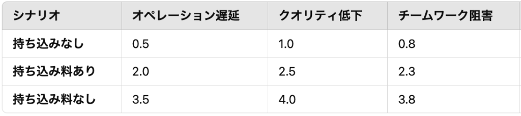 加重平均リスクスコアは、持ち込みを一部許容する場合の全体的なリスクを示します。この値がシナリオ1(持ち込みなし)より高い一方で、シナリオ2(持ち込み料あり)、シナリオ3(持ち込み料なし)よりも低いことから、持ち込み料を課すことで一定のリスク軽減効果があると考えられるものの、本質はそこではないことが読み取れます。
