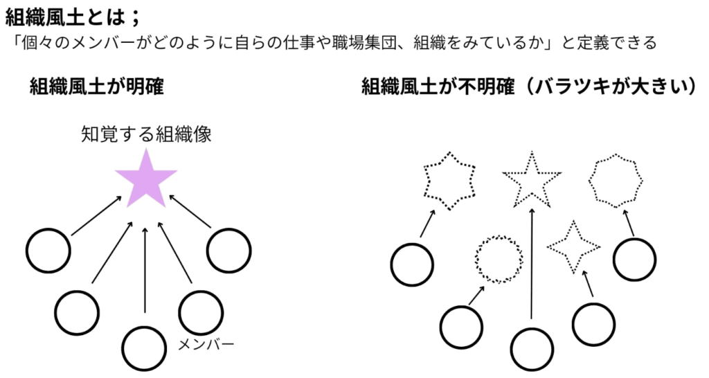 また、組織風土とは「個々のメンバーがどのように自らの仕事や職場集団、組織をみているか」と定義できます。組織風土が明確な組織では、メンバー全員が同じ「組織像」を共有しています。一方、組織風土が不明確な組織では、メンバーごとに認識がバラバラになってしまいます。