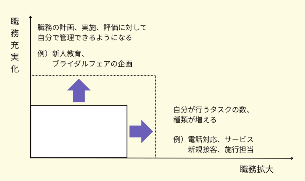 職務充実化(縦軸)は、職務の計画・実施・評価に対して自分で管理できる裁量が増えることを指します。たとえば、新人教育を任される、ブライダルフェアの企画を担当する、といった変化です。