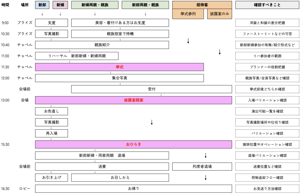 フリープランナーに業務を切り出す際、まず 「当日の完成形を視覚的に示す」 ことが大切です。例えば、上記のような 当日スケジュールの見取り図 を作成し、「誰がどこでなにをするのか」が一目でわかる「その会場の結婚式当日の完成形=ゴール」を明確に共有します。