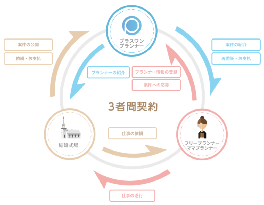 弊社『プラスワン・プランナー』のエージェント型サービスは、婚礼施設様とフリープランナー様をつなぎ、双方が安心してお仕事を進められる環境を整備していることが他社との最大の違いです!!